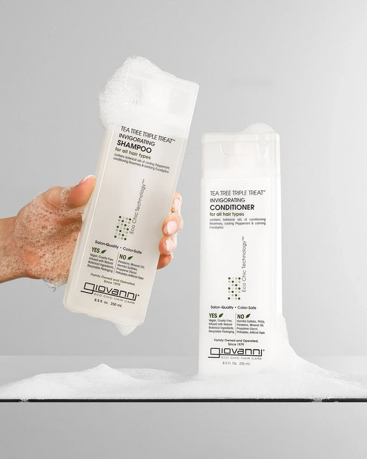 احصلي على تجربة عناية فاخرة لشعركِ وفروة رأسكِ مع شامبو شجرة الشاي ثلاثي الفعالية من جيوفاني، المصمم خصيصاً لتوفير تنظيف متوازن وفعّال يجمع بين الانتعاش والنظافة العميقة والراحة لفروة الرأس. يتميز الشامبو بتركيبة نباتية مبتكرة مدعّمة بـ شجرة الشاي النقية وزيت النعناع المنعش ومستخلص إكليل الجبل والمنثول الطبيعي، مما يمنح فروة الرأس شعوراً فريداً بـ النظافة والبرودة والانتعاش. يعمل الشامبو على تنقية فروة الرأس بلطف من الشوائب والدهون الزائدة دون تجريد الشعر من رطوبته الطبيعية، ليتركه نظيفاً وناعماً ولامعاً. مثالي لمن يرغب في شامبو يوازن بين التنظيف اللطيف والحماية اليومية ويمنح فروة الرأس والشعر شعوراً مستمراً بالحيوية والانتعاش، كما أنه مناسب لجميع أنواع الشعر بما في ذلك الشعر المصبوغ أو المعالج كيميائياً.